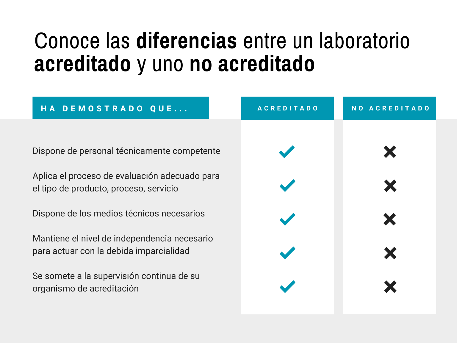 La acreditación se ha consolidado a nivel internacional como la herramienta de referencia para demostrar que un laboratorio es técnicamente competente y opera de acuerdo con los estándares internacionalmente reconocidos. Con ello, nuestros clientes contarán con las máximas garantías, ya que nuestro laboratorio ha demostrado que emplea métodos técnicamente válidos y controlados, que ejecuta de forma correcta sus ensayos, que dispone de los recursos materiales y humanos necesarios, y, por supuesto, que los ensayos están sometidos a estrictos controles internos y externos para asegurar la validez de sus resultados.